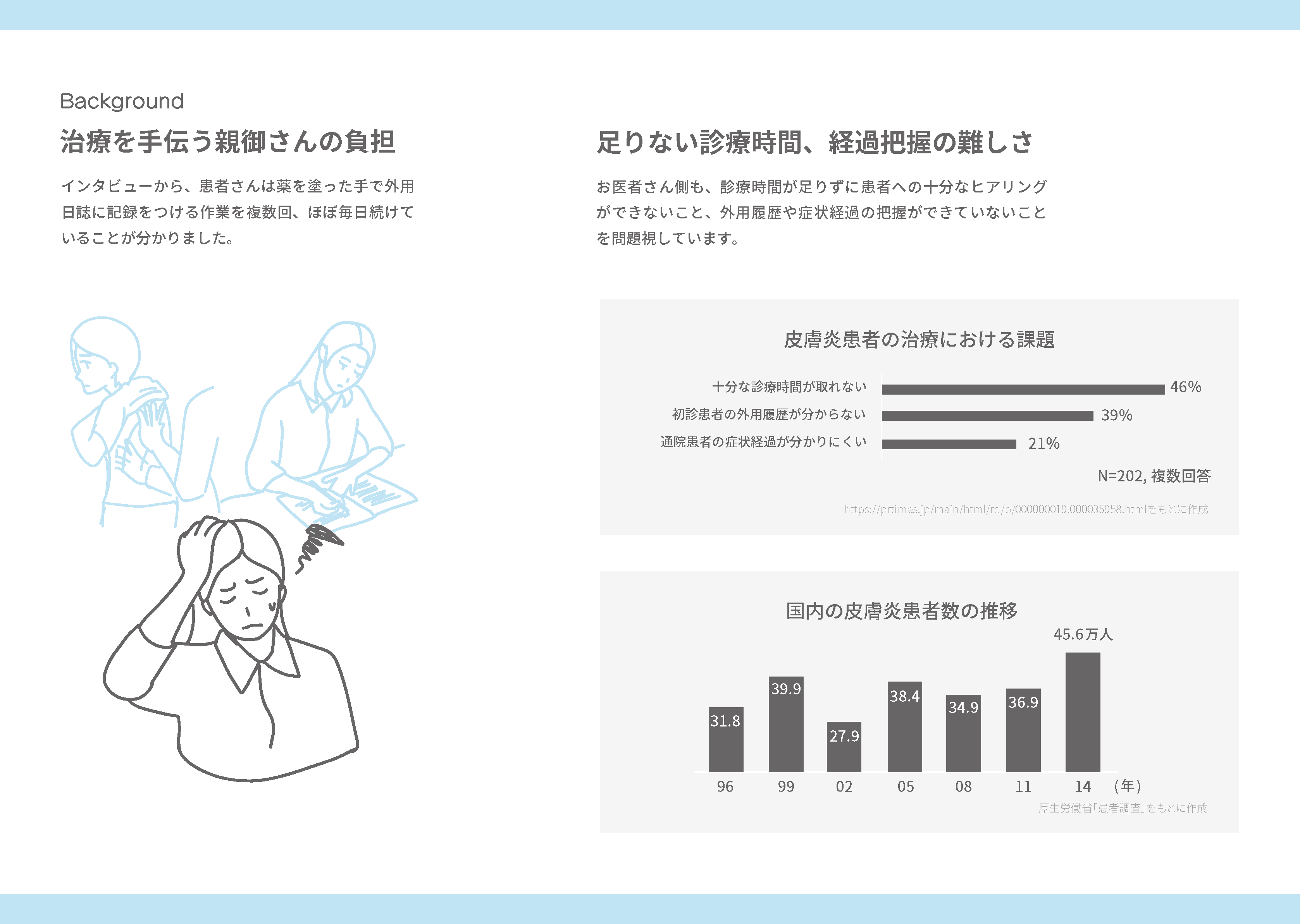 塗った後に記録する手間を省き、子ども自身が塗るように促進することで、皮膚疾患を治療する親御さんの負担を減らします。また、自動記録による情報をお医者さんに提供し、自宅での長期治療のよりよいサポートを目指します。