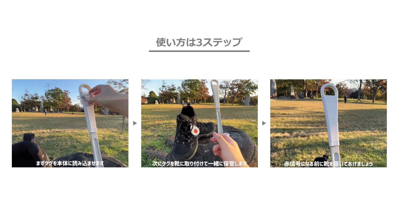 靴を履くという日常の行為に馴染むよう靴ベラと一体化したデバイスにし、ICタグをかざしてタイマーを止めなければならない仕組みによって、保管していた靴を取り出すことを促します。