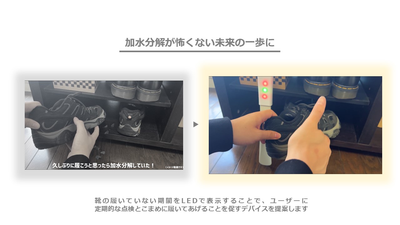 そこで、靴の履いていない期間をLEDで表示することで、ユーザーに定期的な点検とこまめに履いてあげることを促すデバイスを提案します。