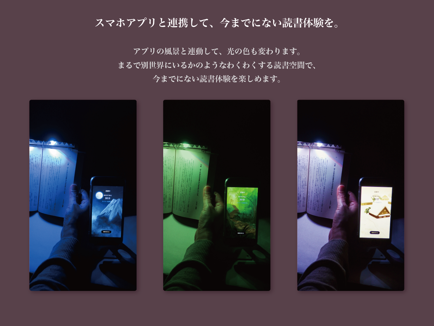 スマホアプリと連携すると、まるで別世界にいるかのようなわくわくする読書空間が生まれます。アプリ内で風景を選択すると、その風景と連動した光の色と癒しのサウンドで別世界を演出します。わくわくする読書空間が、後回しにしがちな読書へのきっかけを作ります。