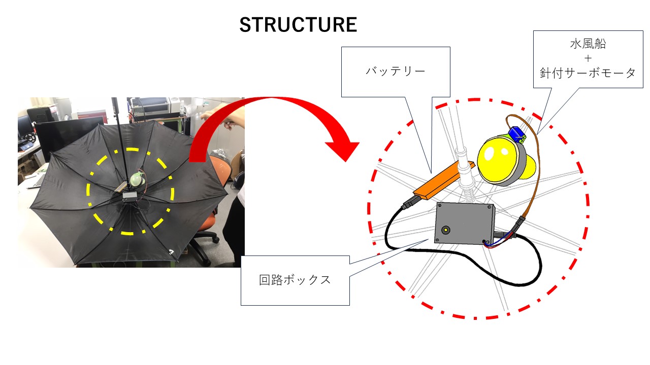 装置は大きく分けて「本体」と「水風船装置」で構成されています。鍵がロックされているとき、本体では加速度センサによって静止しているかどうかの判定が行われています。もし、静止していない状態であると判断した場合、本体のスピーカーからメッセージを再生し警告します。警告を一定時間無視した場合傘が盗まれたと判断し、水風船装置に取り付けた針で水風船を割ることで泥棒にお仕置きをします。