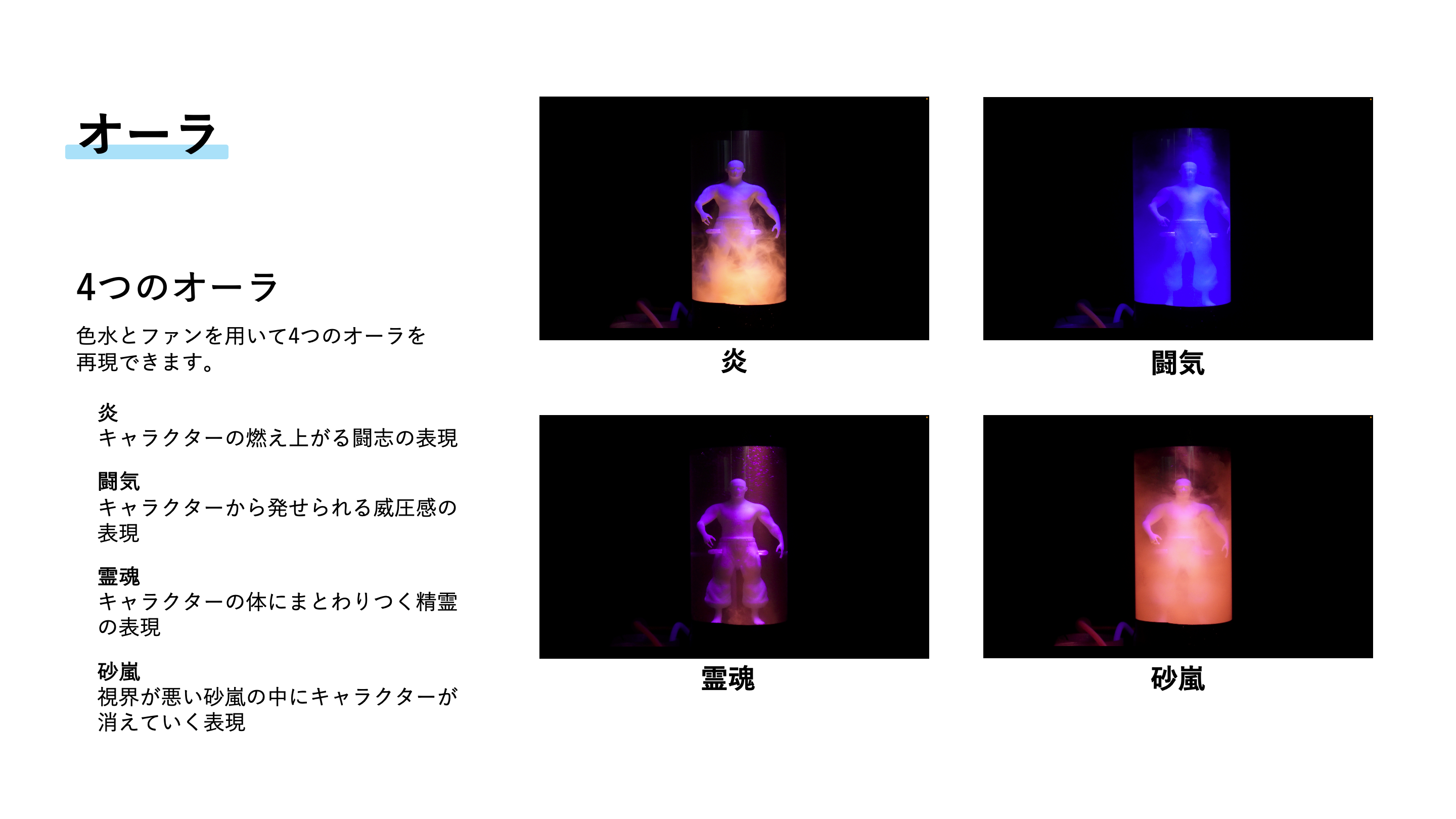 霊魂は、キャラクターの体にまとわりつく精霊の表現で、少量の赤の蛍光塗料を小刻みに注入することで再現しています。
