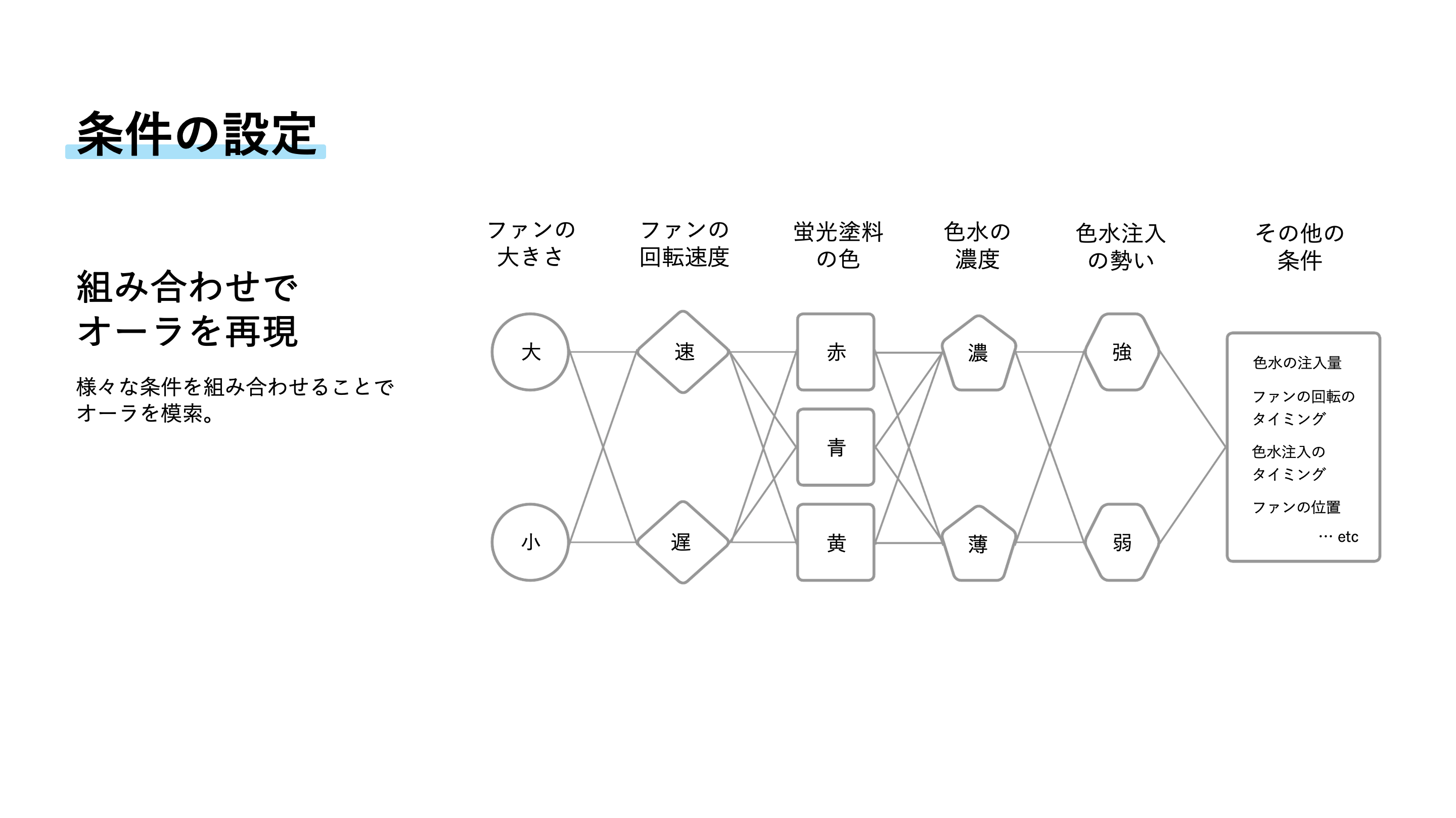 実現にあたり注目したのが、液体の拡散現象です。Aura Flowは真水で満たしたパイプ内に色水を注入し、ファンを用いて水流を変化させることで、4つのオーラ的なエフェクトを再現します。