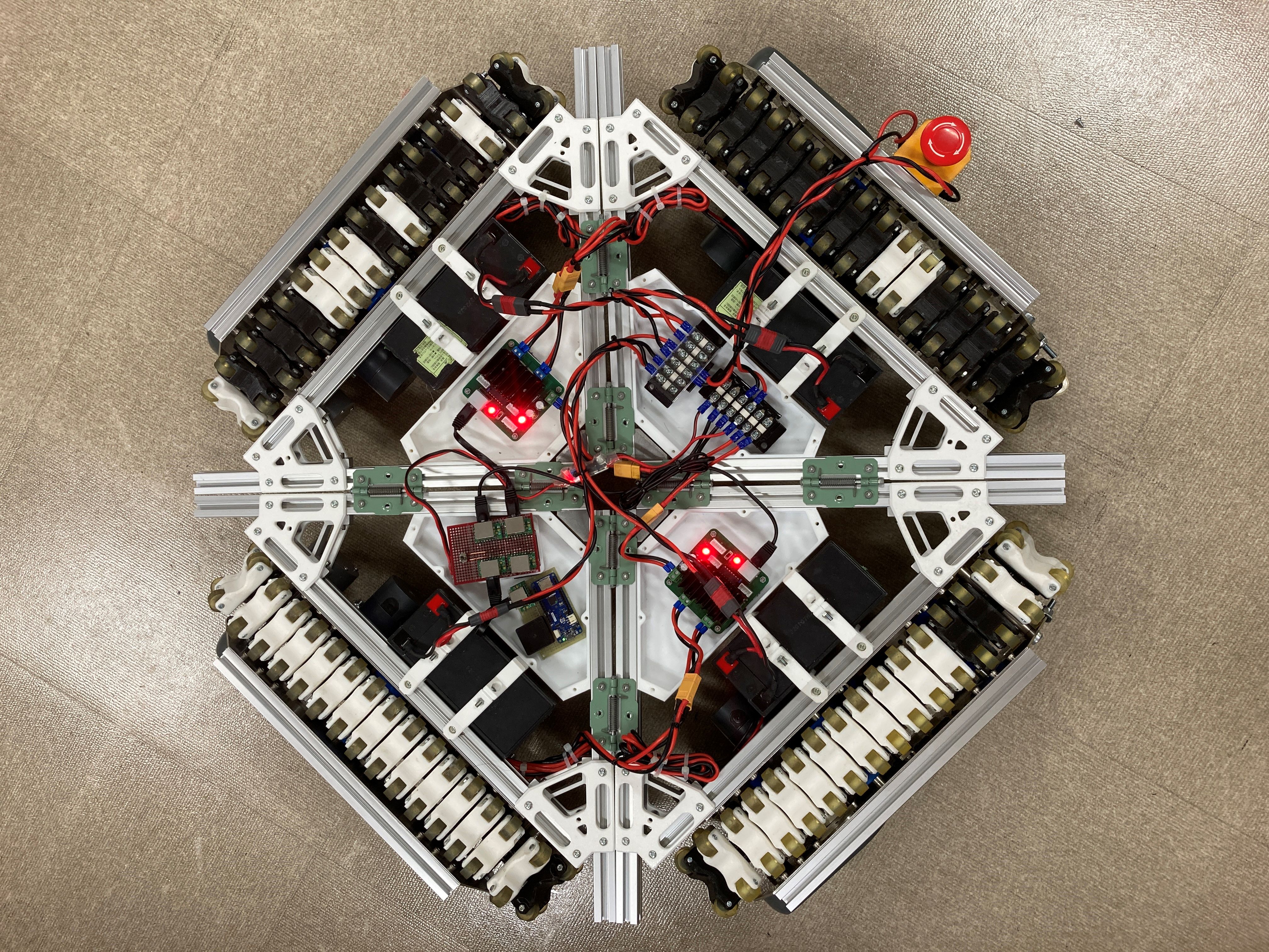 この機構の最初に開発したのは東京工業大学の広瀬先生で”座布団ロボット”というのが最初になり、その後もいくつか研究が続けられてきました。しかしここ十数年の研究は少なく、実際の不整地での動作実績もあまりありません、そして重量物を載せた際の動作特性がまだわかってないなど、技術としてまだ未知数な面があります。今後のロボットがより広範囲に活躍するためには移動機構の開発が重要であり、この機構をより細かく研究することでより実用的なロボットが開発できると考えていおります。
