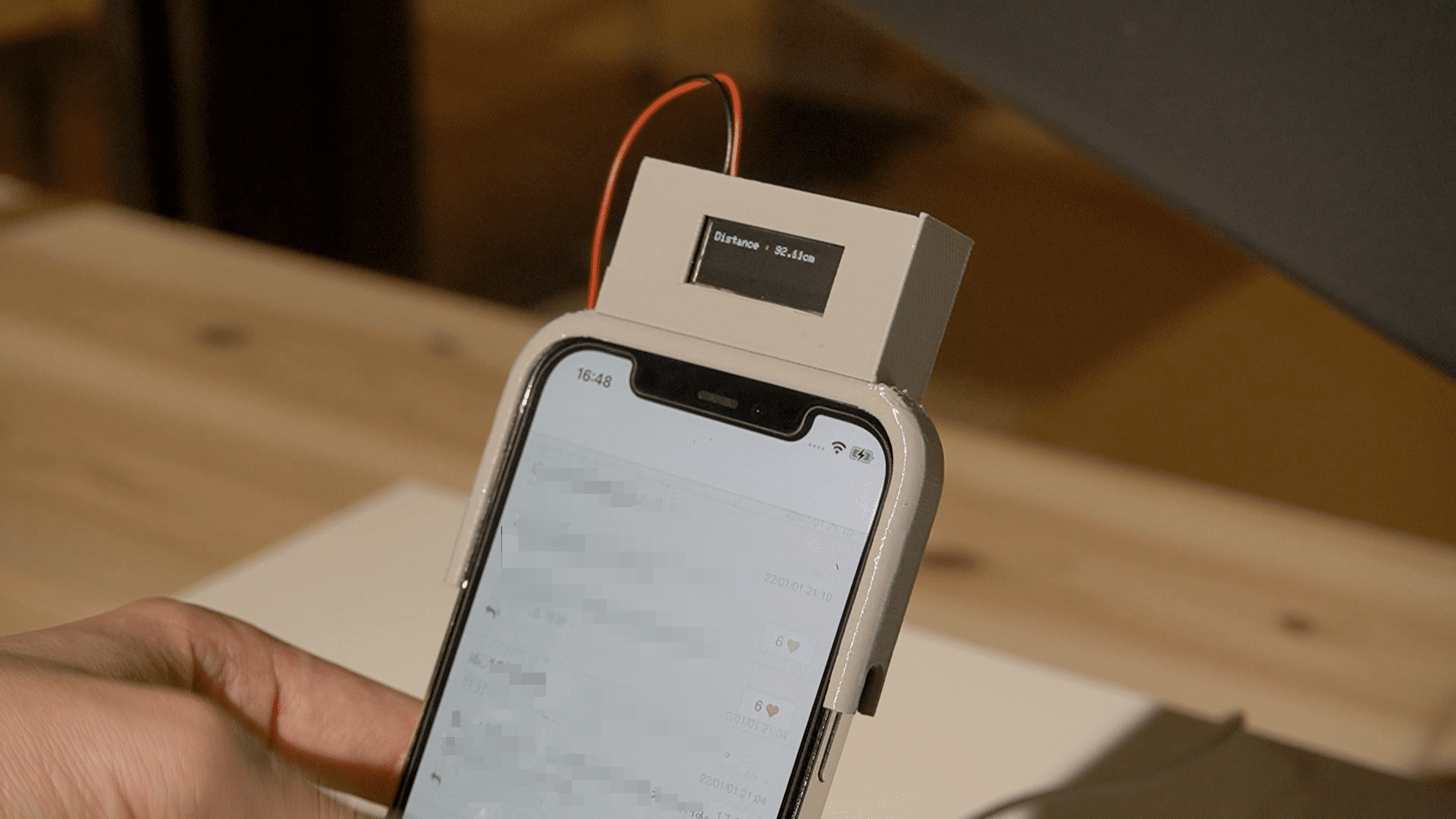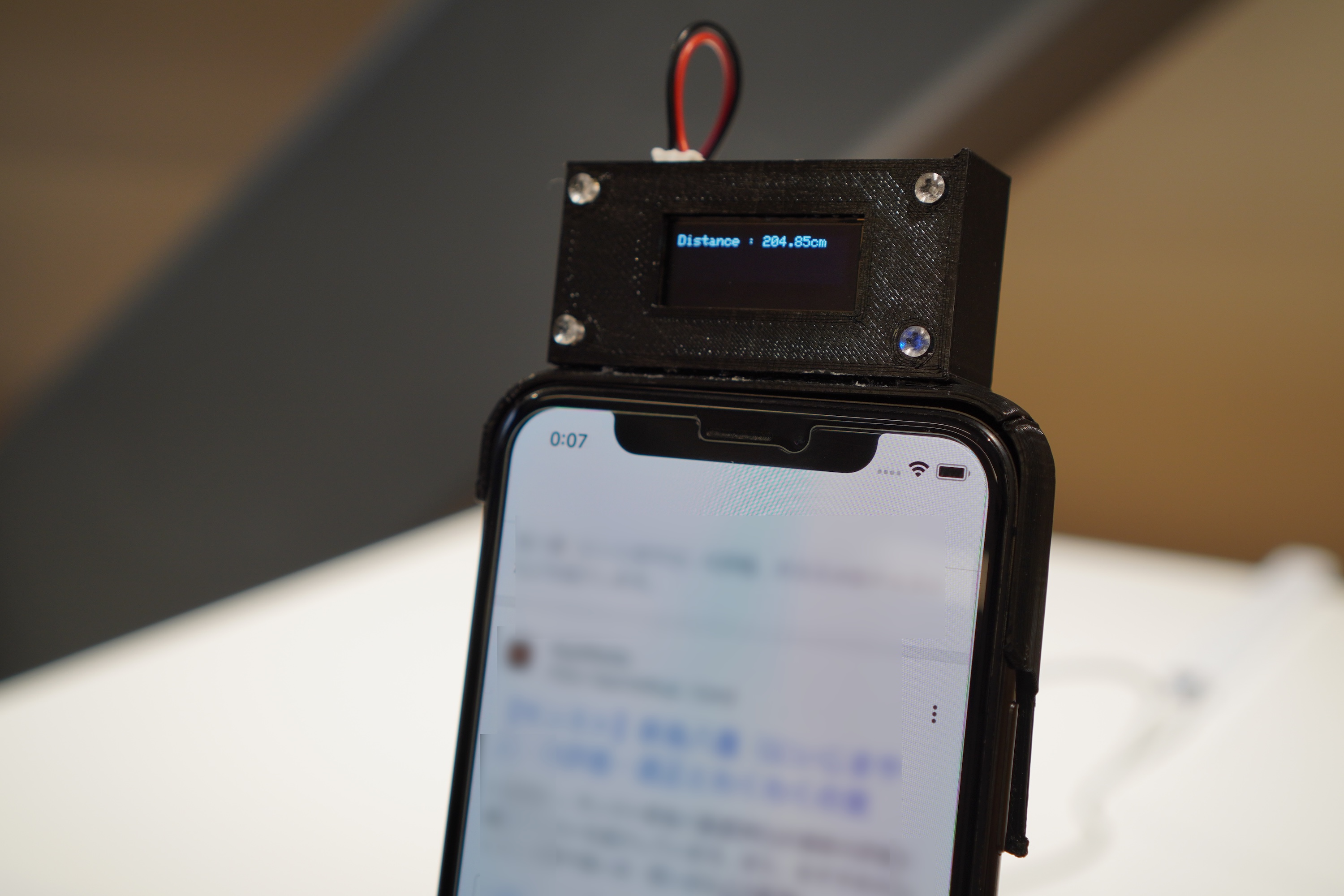 Adafruit 社Feather 32u4 に128x32 のOLED ディスプレイを接続したスマートフォンのカバーをFusion360 で設計し、3D プリンタで出力した。