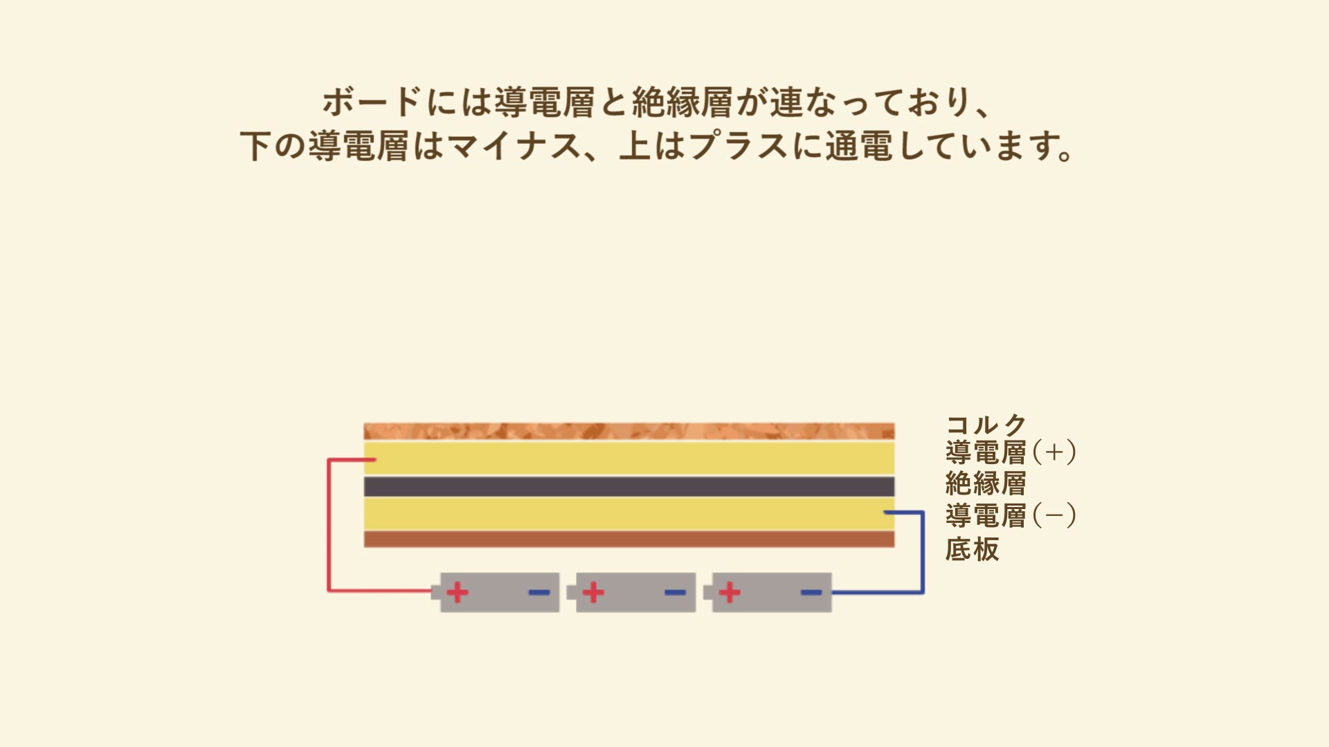 コルクボードは実は1層ではありません。コルクの層に加え、金属でできた導電層がふたつあり、それぞれプラスとマイナスに導電しています。
