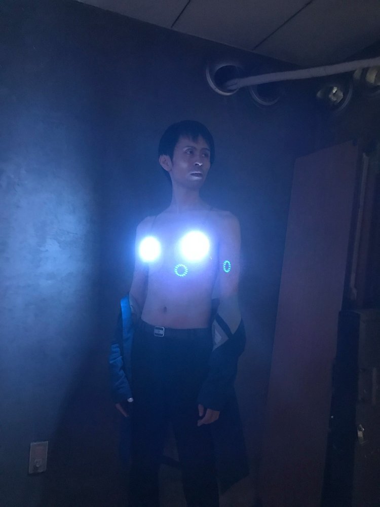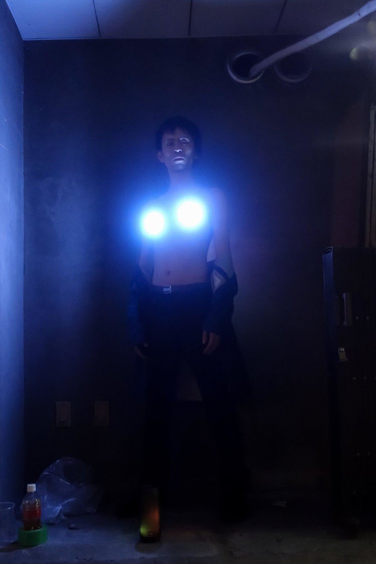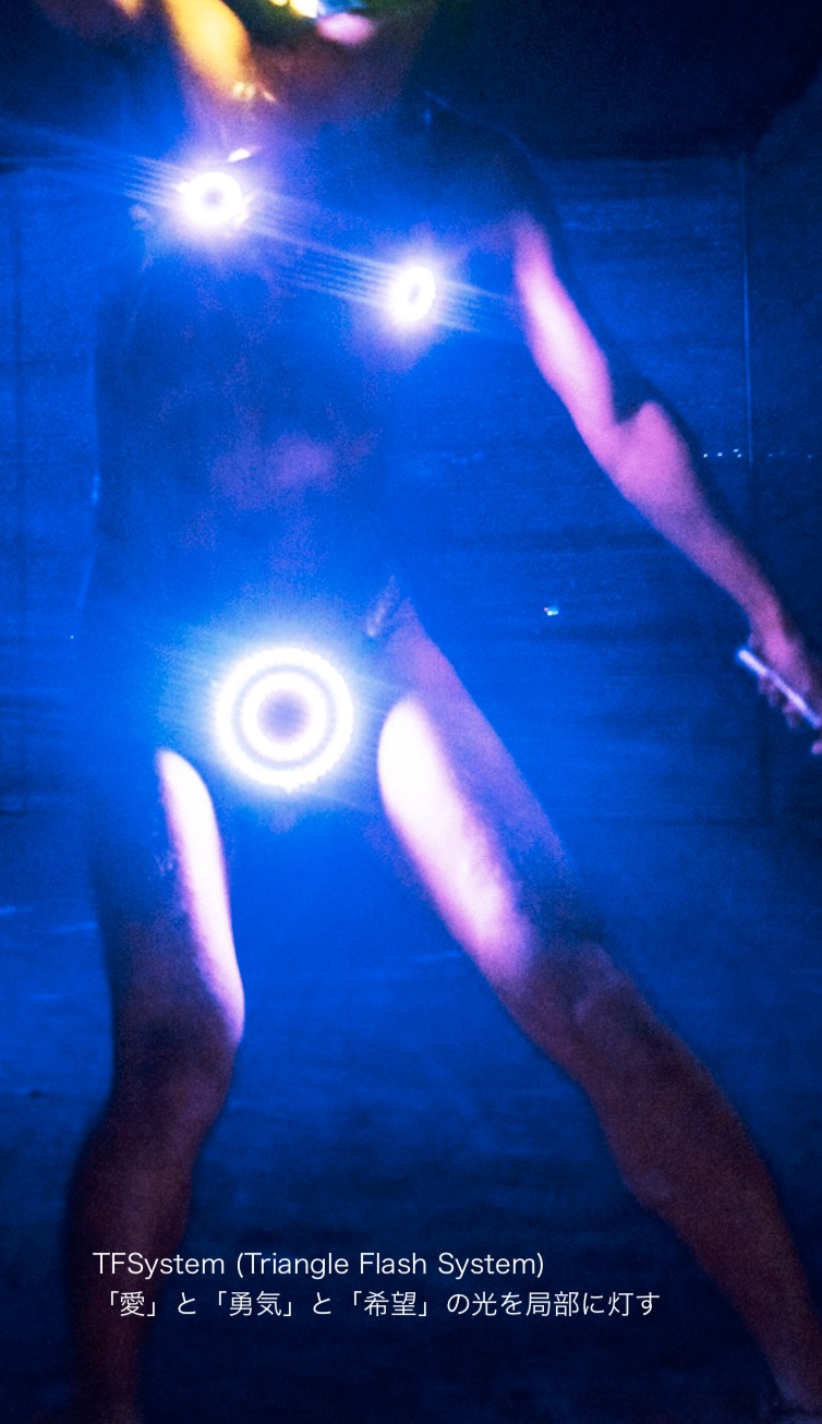 世界中では未だあらゆる差別意識が蔓延り、悩みを抱えて生きている人々は後を絶たない。 大抵の差 別は、人種・ジェンダー・マイノリティなどで人を選別し、負のレッテルを貼ることから生じる。 身 分・階級・職業・肩書、人間は社会によって後付された優劣を身にまとって生きている。 しかし全て のレッテルを脱ぎ捨てれば、そこにいるのは皆同じ、裸一貫の人間である。 我々の考える理想は、あらゆるレッテルを排し、全ての人々が素の自分を露わにできる人間社会の実現。 レッテルを脱ぎ捨て て全裸となり対等な意識を共有する人々を「ネオナチュリスト」と称し、 ネオナチュリストによる新 たな人間社会の実現を理想に掲げる。 とはいえ現実は、有史以前から服に身と心を隠すことで培われ た羞恥心が邪魔をして、 人々は素の自分を見せることに強い抵抗感を感じている。 この問題を解決す るためには、人前で裸になりつつも羞恥心を取り除けるような、人々をネオナチュリストへと導く新 しいインターフェイスが必要であると考えた。 こうした経緯で辿り着いたアイディアが、局部を隠すこ となく公然と人前に出られる新時代のウェア。 局部の周囲に装着する「閃光リング」により見る者の 目を眩ませ、 局部を露出していながら局部が見えないというブレイクスルーを実現した。これにより 人前で全裸になることが不慣れな人でも、見られていないという思いが羞恥心を和らげ、徐々に人前で 全裸になることの抵抗感が薄れていく。