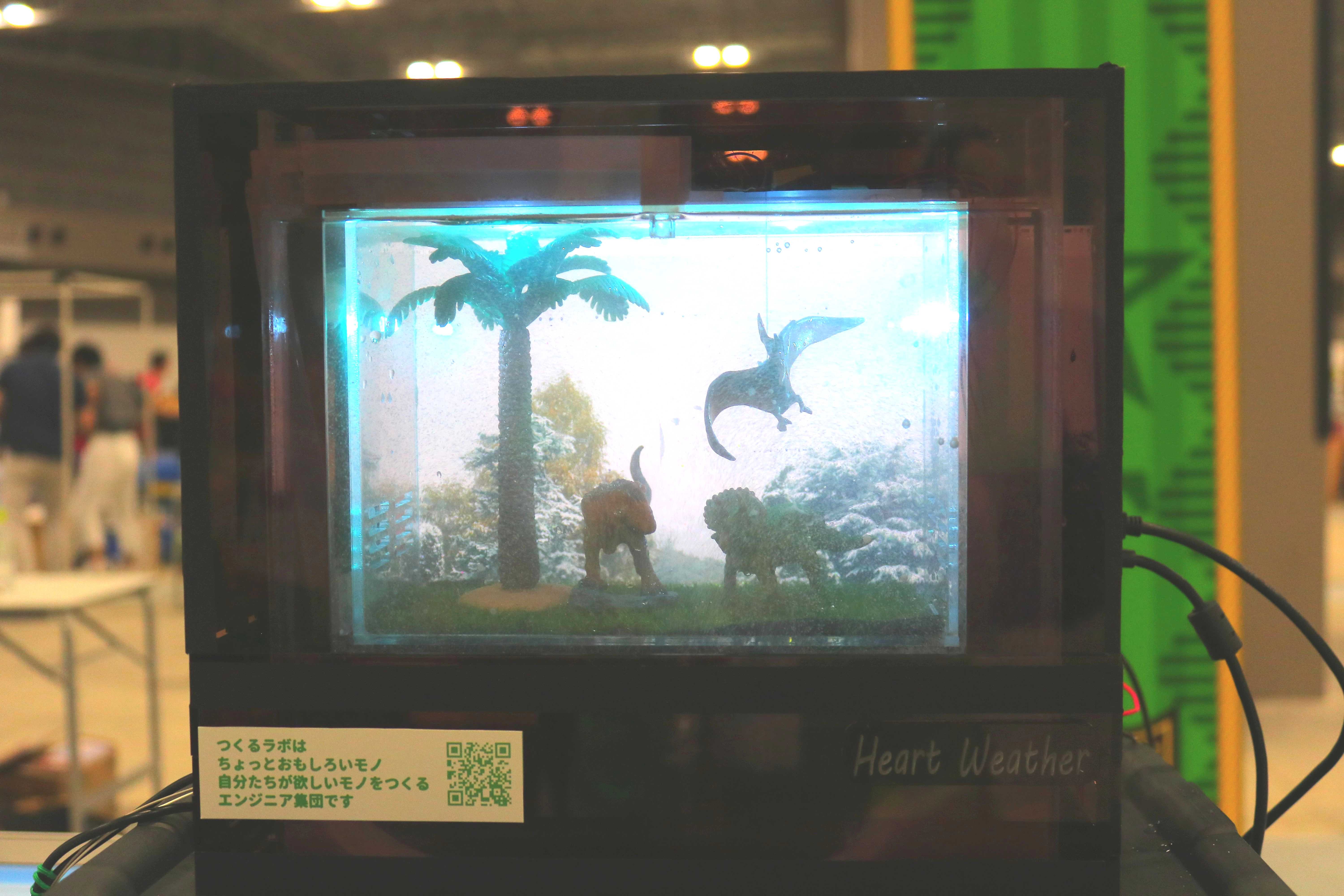 Heart Weatherは水槽状の箱庭部、背面のディスプレイ、上部および両側面のフルカラーLED、降雨機構および降雪機構で構成されています。背面ディスプレイでは天気に応じた背景を表示し、LEDが箱庭内のオブジェを照らします。片側のLEDのみを点灯させることで西日を表現することもできます。雨のときは下部に設置した水槽からポンプで水を引き上げ上部に設置した降雨機構から箱庭内に水滴を降らせます。手前に設置した降雪機構は水槽になっており、雪のときには水槽の中の水をポンプを用いて循環させることで、雪に見立てた砂を対流させ、雪が舞う様子を表現します。