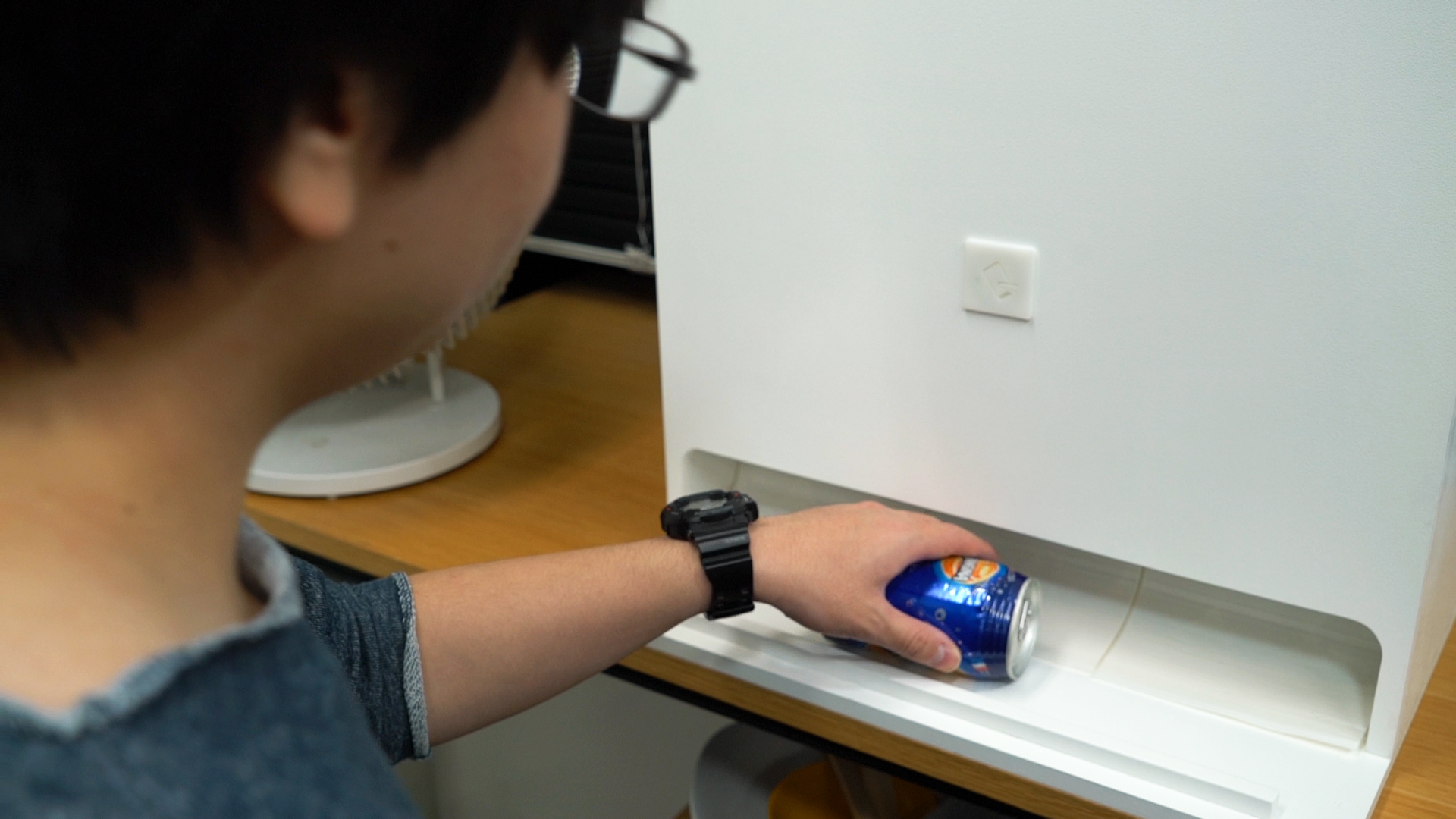 ボタンやディスプレイをスマートフォン上に移すことによって、自動販売機は、白いハコになりました。その白い筐体は周りのインテリアにも溶け込むでしょう。