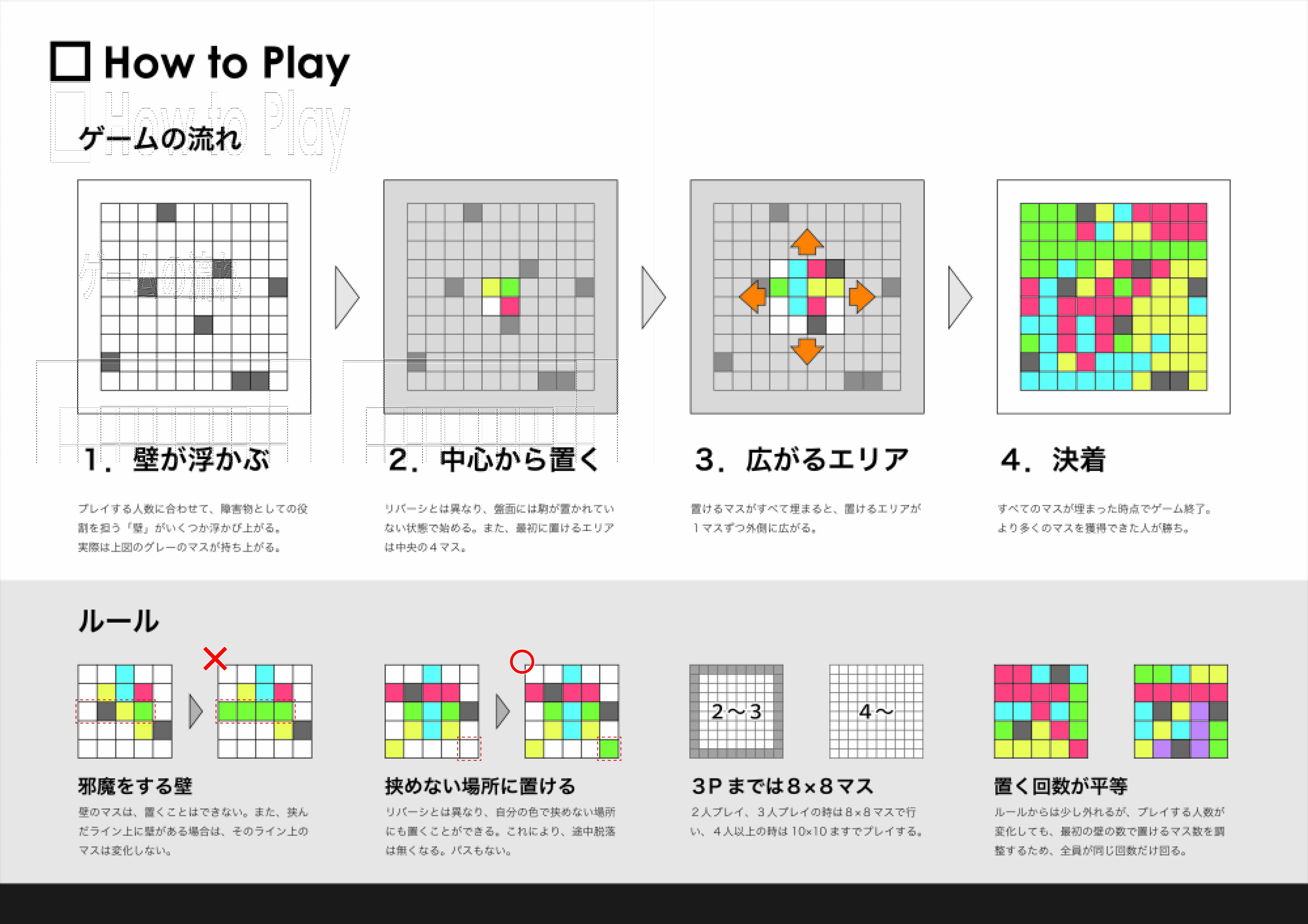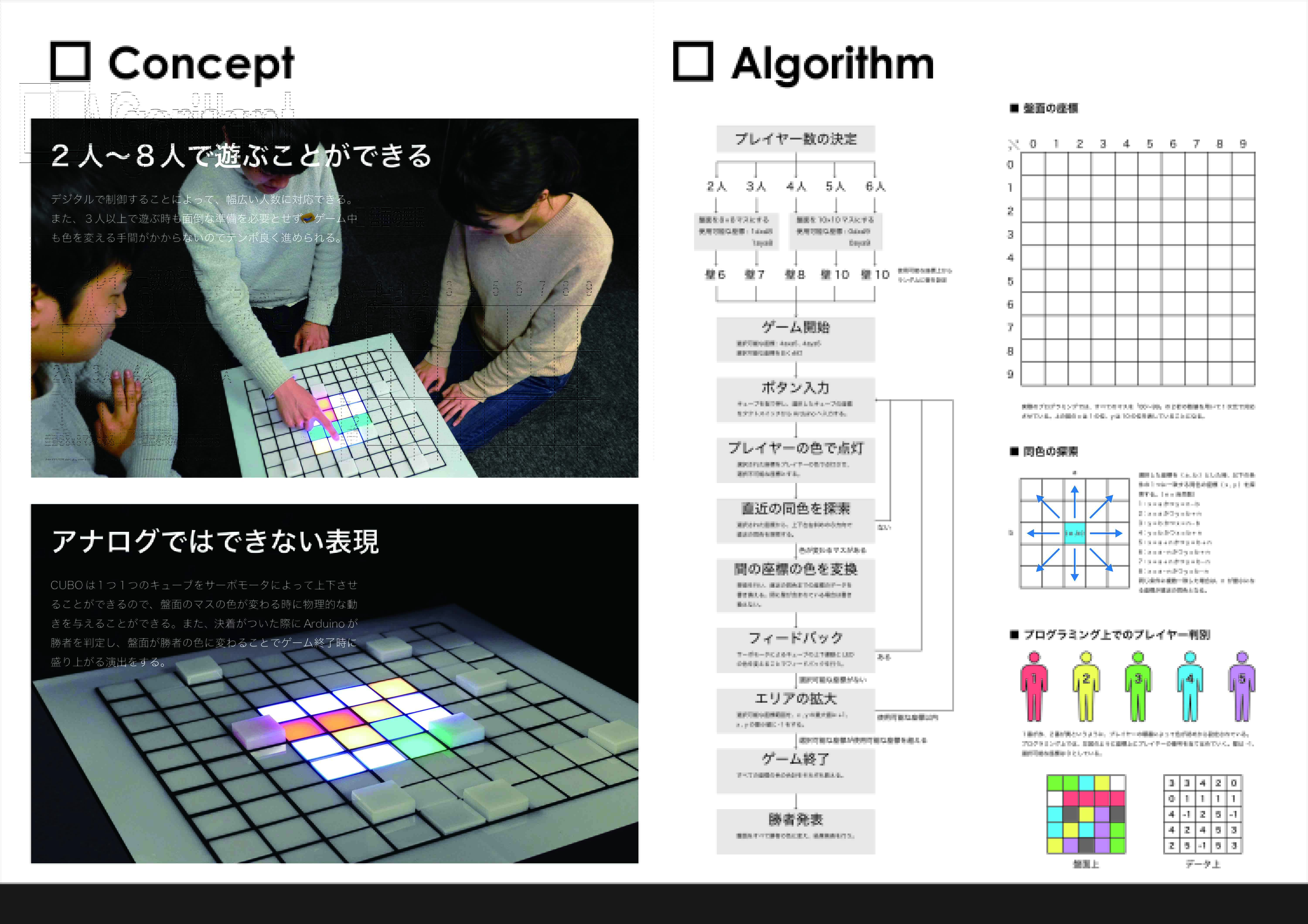 オセロのルールをベースとしており、石がひっくり返る様子をキューブの上下によって表現しています。