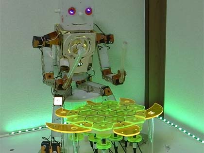 亀の形をしたアクリル製の楽器です。甲羅をたたくと、楽器の音が鳴ります。楽器の音色はピアノ、マリンバなど選択可能です。甲羅は13枚あるので、13種類の音からなる音階を演奏することができます。 ロボットに演奏させるために作られた楽器ですが、人間が演奏することもできます。