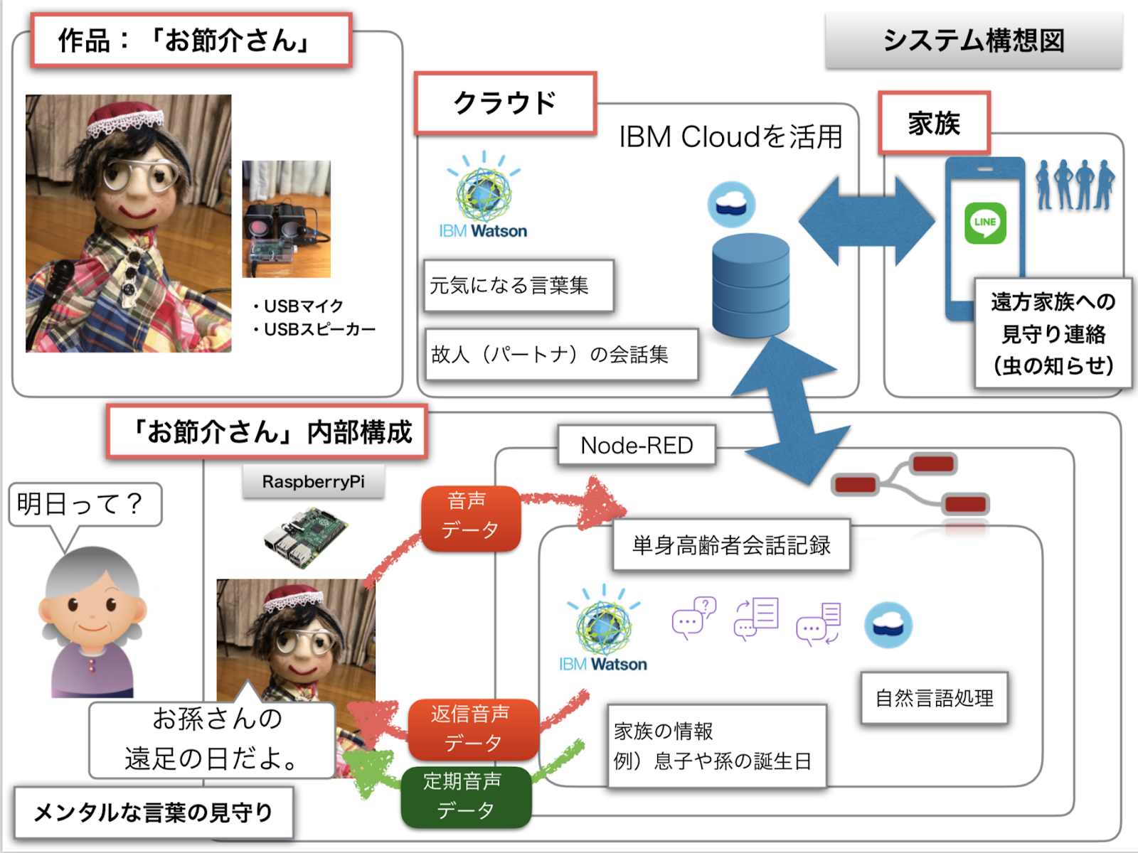 「ヒト」が「AI」をアシストすることにより、単身高齢者、見守る側(遠方の家族)、双方で「お節介さん」を通じて物理的距離を超えたコミュニケーションを提供します。