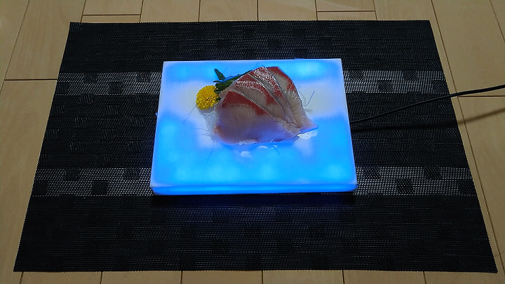 「さかな」や「かい」など、海から得られるような食べ物をのせると、お皿の照明が「海」を表現して点灯します。