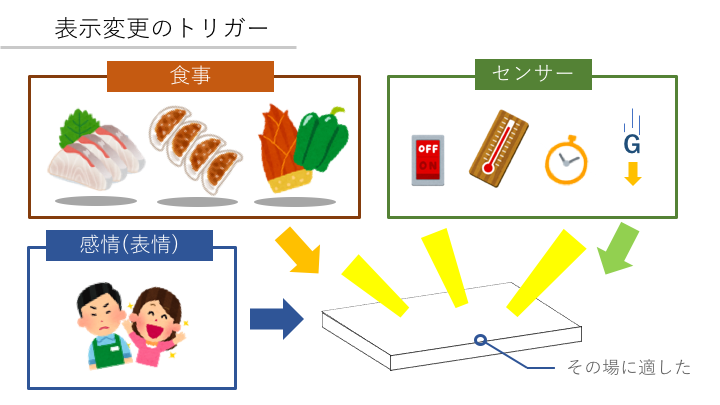 それは食事の対象に合わせた照明の点灯から、食べ物の魅力を際立たせるような仕組みです。