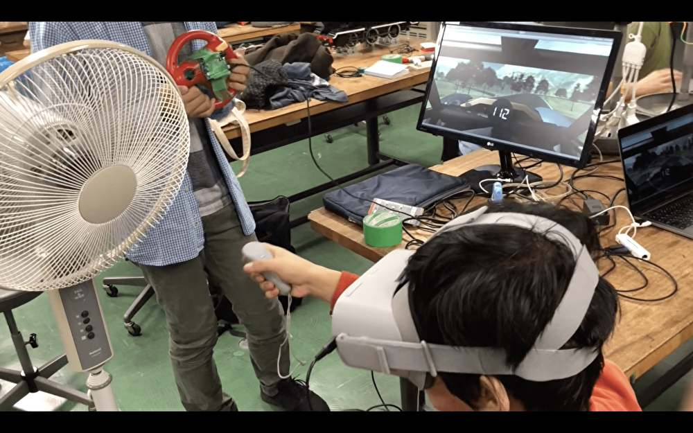 最近流行りのVRに、リアルな体験を提供する4Dを組み合わせたレーシングゲームです。高校の文化祭の展示として開発されました。2人プレイで、プレイヤーはドライバー(現実)とシューター(VR)に分かれます。ドライバーはVRゴーグルを被らず、ディスプレイを見ながらハンドル型コントローラを握り、レースカーを操作します。シューターはVRゴーグルを被り、進路を妨げてくる敵を撃ち倒します。本作品はVRゴーグル、PC、扇風機、マッサージ機、霧吹き、椅子(予定)と、大規模な連動を行なっています。扇風機は速度に合わせて強さを段階的に増減し、マッサージ機は敵とレースカーがぶつかったときに振動し、霧吹きは応援してくれているunityちゃんを撃つと水を放ちます。現在は未実装ですが、コースの傾斜に合わせて椅子をリクライニングさせる予定です。また、この作品は、二人プレイにすることで、作品の回転率をあげるとともに、あまり普段ゲームを一緒にやらないような家族連れでも、協力してプレイし、作品を通じてコミュニケーションを図るという側面もあります。このように、現実とVRを超えた通信と会話のコミュニケーションを促進させる作品となっております。