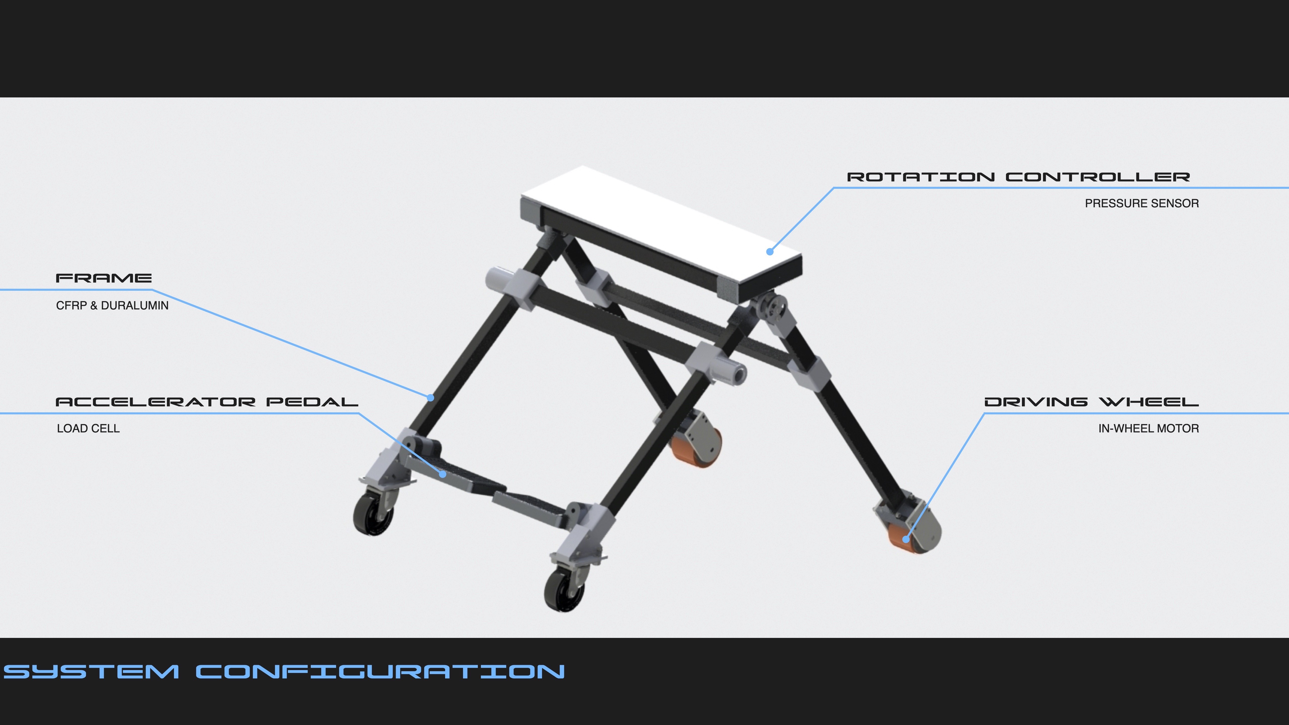 私たちが提案するWeMoは、モビリティを身に纏うことにより、人の歩行とデバイスによる走行の融和や、現状の都市の環境を変更することなく移動の最適化を実現します。 WeMoは、不整地でも安定した走行を可能にする車輪駆動部、体重を支える強度を持ちながら軽量であるCFRPや超々ジュラルミンを用いたフレーム部、両手を塞ぐことなく体重移動で直感的な操作を可能とするセンサによるコントロール・インタフェース、モビリティデバイスを違和感なく装着できる装着ベルトから構成されています。走行モードでは、ユーザはWeMoのフレームに腰掛け、電動の車輪により移動します。一方、歩行モードでは、人の歩行を阻害しないようにWeMoのフレームが折り畳まれ、階段の昇降や段差を越えることが可能となります。WeMoを利用することにより、買い物帰りに両手に荷物を持った状態でのスーパーから自宅への移動、入り組んだ路地、駅や空港など配送トラックが入れない環境での物流で利用できます。WeMoは、このような利用シーンでユーザの移動時のユーザエクスペリエンスを最大化します。